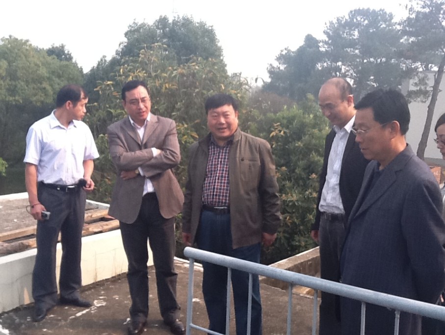 10月21日,省物價(jià)局環(huán)境與資源價(jià)格處吳賢武處長(zhǎng)(左三)、成本調(diào)查監(jiān)審分局吳勤民科長(zhǎng)(左二)在市物價(jià)局局長(zhǎng)汪順彪(右二)、總公司黨委書記陳永根(右三)陪同下視察市二水廠。