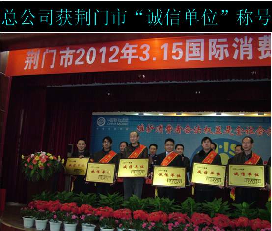 3.15國際消費日前夕,在荊門市開展的“萬名消費者評誠信”活動中,經(jīng)過廣大消費者投票評選,荊門市供水總公司被市文明委、市工商行政管理局、市消委聯(lián)合授予“誠信單位”,并取得第三名的好成績。圖為黨委書記陳永根在表彰會上接受牌匾。