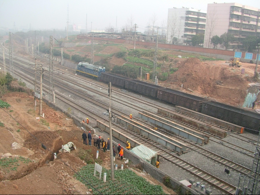 經(jīng)供水公司與鐵路部門協(xié)調(diào),武漢鐵路局、武鐵設(shè)計(jì)院、西南設(shè)計(jì)院擬訂采用架空項(xiàng)進(jìn)法穿越焦柳鐵路線5股道,定制鋼筋砼套管,管節(jié)間采用鋼板內(nèi)漲圈接口。在調(diào)查鐵路信號(hào)、通信光電纜徑路及數(shù)量,在確保鐵路運(yùn)輸安全的原則下進(jìn)行防護(hù)設(shè)計(jì)。武漢鐵路局工務(wù)檢測所編制施工圖。項(xiàng)目委托武鐵江騰公司具體施工。供水公司則完成穿管、銜接施工。