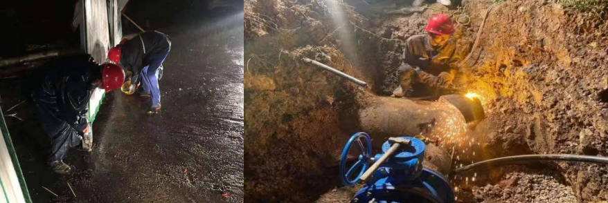 2020年1月28日上午,集團維修公司接到用戶電話,反映塔影路與白云大道交匯處爆管。搶修隊伍聞令而動,立即趕赴現(xiàn)場,在了解具體情況后,黨員吳英煉帶頭與時間賽跑,克服地面硬化、并行管道多、不能通過機械開挖等諸多不利因素,人工開鑿,找準漏點,鏖戰(zhàn)3小時,終于趕在中午“飯點”恢復供水,解決了用戶的“燃眉之急”。