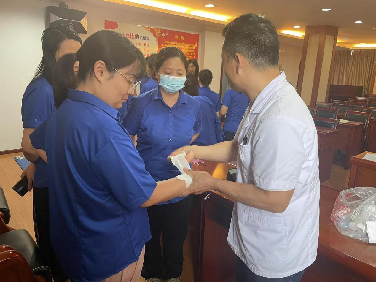 黃主任結(jié)合集團實際,講解了燒傷急救、毒蛇咬傷、狂犬咬傷等外傷急救基本技術(shù),并現(xiàn)場示范包扎止血的方法,以及轉(zhuǎn)運受傷病人的注意事項。