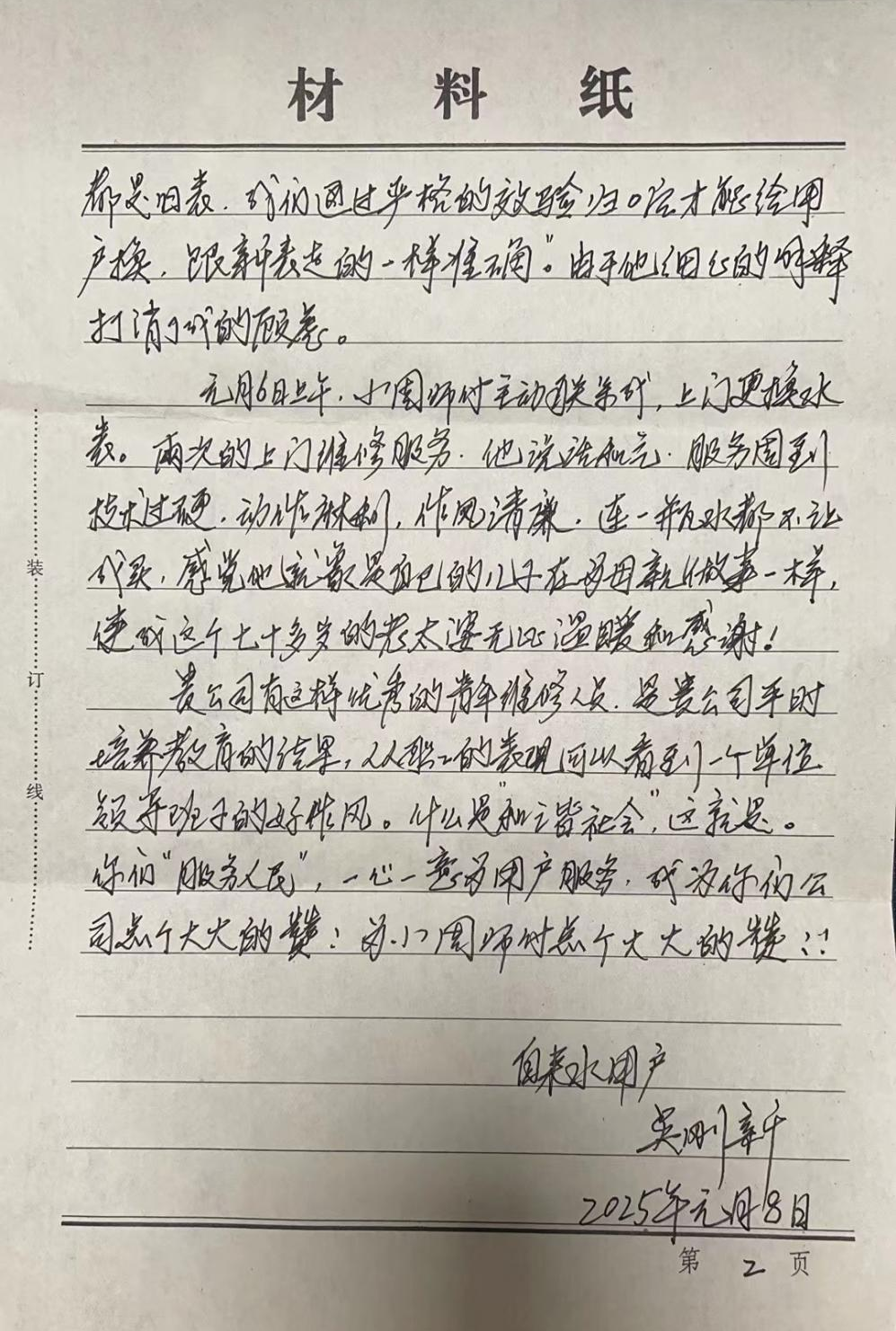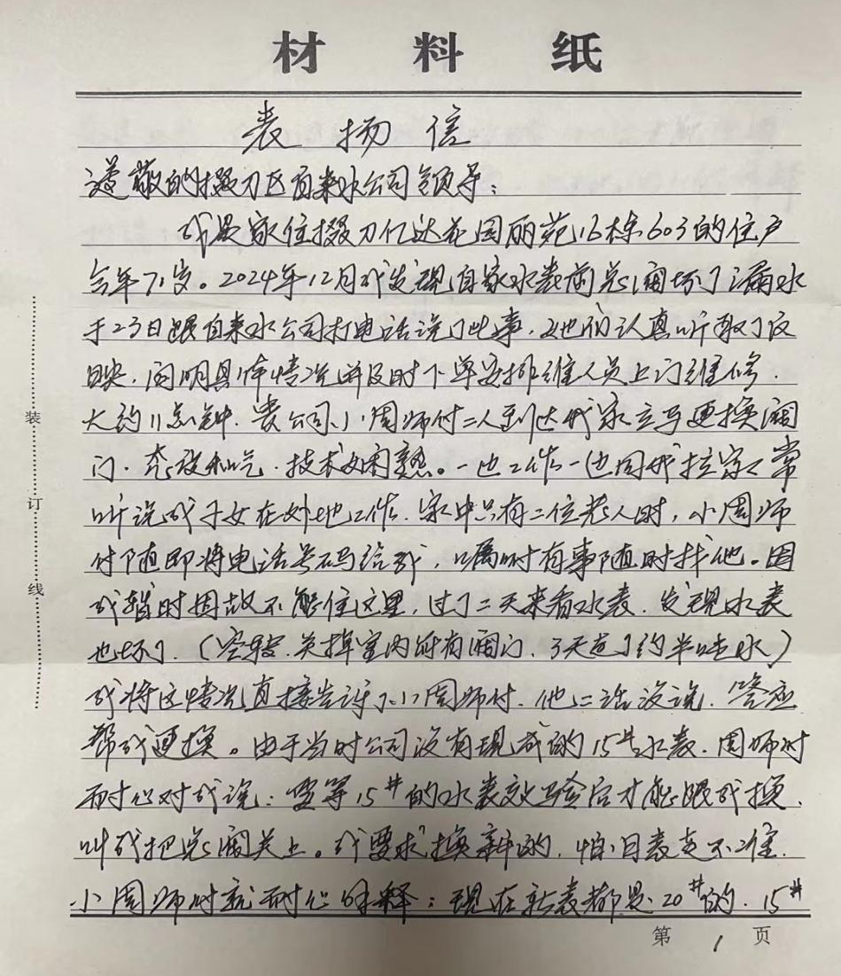 在表?yè)P(yáng)信中,老人深情表達(dá):“家中只有我們兩位老人,水務(wù)集團(tuán)的維修人員就像我們的兒子一樣,他說(shuō)話和氣,服務(wù)周到,技術(shù)過(guò)硬,動(dòng)作麻利,作風(fēng)清廉,讓我們感到無(wú)比溫暖。”