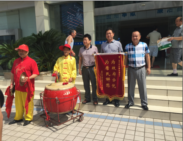 7月31日,虎牙關(guān)社區(qū)和用戶代表組織腰鼓隊(duì)到總公司送錦旗致謝。據(jù)悉,掇刀城南新區(qū)金苑大市場(chǎng)主、分水管網(wǎng)嚴(yán)重老化,水管破損而致停水。市供水總公司客服部門(mén)快速勘測(cè)報(bào)裝,維修處迅速組織施工,并調(diào)派應(yīng)急供水車(chē)在改造期間為商戶送水。