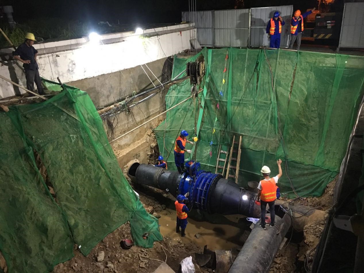 20日晚10時,項目現(xiàn)場管理人員強化工序銜接,緊盯現(xiàn)場監(jiān)督,施工作業(yè)人員挑燈夜戰(zhàn),施工隊伍兵分三路,密切協(xié)調配合,分別對DN1200、DN1000鋼管共5處碰頭點進行施工,管道切割、排水、吊裝、安裝閥門、焊接……施工現(xiàn)場井然有序,一道道工序推進有條不紊,不一會兒工人們的汗水都濕透了全身。21日凌晨2:00突降暴雨,施工人員“硬核”表現(xiàn),克服惡劣天氣的影響,在水中連續(xù)辛勤作業(yè)近10個小時,碰頭任務于21日8時順利完工。