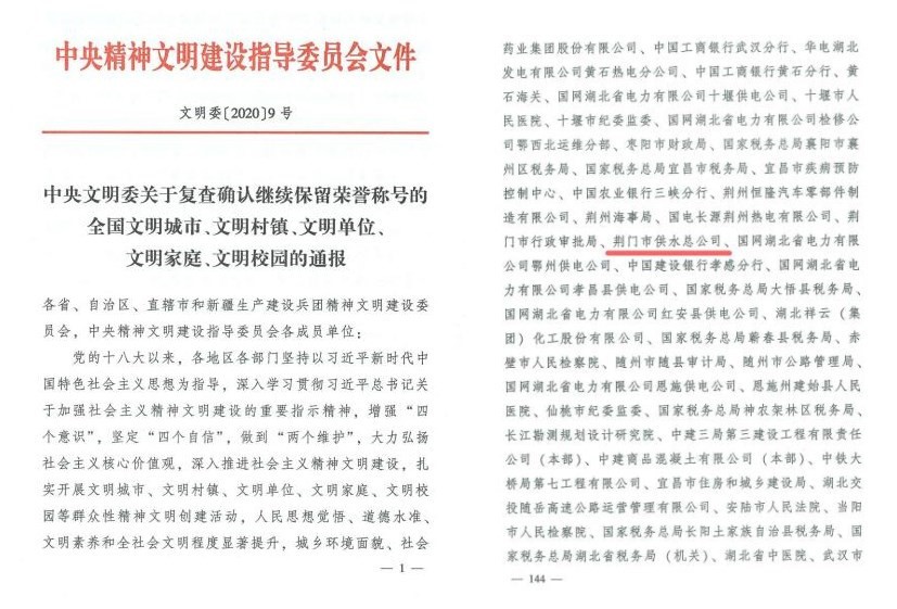 據(jù)悉,“全國(guó)文明單位”稱號(hào)是中央文明委授予創(chuàng)建單位的最高榮譽(yù)。市供水總公司繼續(xù)保留榮譽(yù)稱號(hào),是企業(yè)文明單位創(chuàng)建活動(dòng)扎實(shí)推進(jìn)、創(chuàng)新發(fā)展的一大豐碩成果。公司連續(xù)十一屆被省委、省政府授予省級(jí)文明單位,連續(xù)十二屆被市委、市政府授予市最佳文明單位,2017年被中央文明辦授予“全國(guó)文明單位”。2018年,在市消費(fèi)者委員會(huì)發(fā)起的公服企業(yè)滿意度調(diào)查中,公司總成績(jī)排名第一,被授予“消費(fèi)者滿意單位”和“消費(fèi)者滿意品牌”。2019年,由于成功推行卓越績(jī)效管理和用戶滿意管理,被市政府評(píng)選為第七屆荊門市“市長(zhǎng)質(zhì)量獎(jiǎng)”獲獎(jiǎng)企業(yè);因全面推進(jìn)依法治企,被評(píng)為湖北省省級(jí)“法治建設(shè)示范企業(yè)”;被荊楚網(wǎng)表彰為“全省優(yōu)秀政務(wù)微信公眾號(hào)”;作為全國(guó)唯一一家供水企業(yè),榮獲2019年全國(guó)市場(chǎng)質(zhì)量信用AA等級(jí)“用戶滿意企業(yè)”稱號(hào)。2020年,公司先后被評(píng)為荊門市建設(shè)江漢平原振興發(fā)展示范區(qū)先進(jìn)集體,在全市要素保障類滿意度測(cè)評(píng)中繼續(xù)名列榜首。三水廠團(tuán)支部被共青團(tuán)中央表彰為“全國(guó)五四紅旗團(tuán)支部”。詠泉水質(zhì)檢測(cè)有限公司曹俊同志榮獲“全市優(yōu)秀共產(chǎn)黨員”和“荊門市抗擊新冠肺炎疫情先進(jìn)個(gè)人”榮譽(yù),供水維修班長(zhǎng)黃磊獲評(píng)“荊門好人·最美逆行者”榮譽(yù)稱號(hào),加壓站員工閆寒家庭榮獲2020年“最美家庭”榮譽(yù)稱號(hào)。
