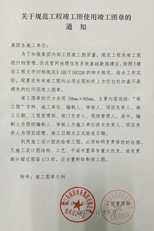 近日,技術(shù)設(shè)計中心為了加強集團內(nèi)部工程竣工圖質(zhì)量,規(guī)范工程類竣工圖紙歸檔管理,促進管網(wǎng)地理信息系統(tǒng)基礎(chǔ)數(shù)據(jù)建設(shè),聯(lián)合工程管理部編發(fā)了規(guī)范工程竣工圖使用竣工圖章的要求和指導意見。